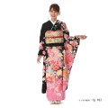 黒地にピンクのぼかしが映える振袖は、大きいサイズ。地色の黒が引き締まった印象を与えてくれるので、裾先のピンク色は膨張色として気になりません。大柄な方も安心してお召しいただけます。