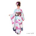 スカイブルーのような水色から赤紫色、そして濃紺へと変化する地色に、大輪の薔薇が大胆に配された振袖です。この振袖は、1999年のパリコレで第42回FEC特別賞受賞のファッションデザイナー・ヒロミチナカノによるものです。