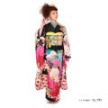 今風の印象の振袖ですが、描かれているモチーフは全て日本の伝統的なもの。裾の方に描かれている扇を繰り返したような柄は青海波といい、波を表しています。波は寄せて返し止まることのないことから、永遠を思わせる縁起の良いモチーフです。松竹梅は言わずとしれたおめでたい組み合わせですね。牡丹は、豊かさと美しさを象徴し、百花の長と言われています。風に揺れる姿が優美な藤の花は、歓迎の意味を持っています。このように、縁起も良く古くから日本人に愛されてきた伝統モチーフを描きながら、全体の印象が現代的なのは、そのポップな色遣いのお蔭でしょう。黒い地色は、明るい色の数々を引き立てます。