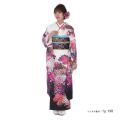 地色は、白を中心に、膝下あたりからは濃いグレー。裾に向かって色が濃くなる裾濃(すそご)の色遣いは、立ち姿に奥行きを与えてくれます。そんな地色の上に描かれているのは、松、桜、菊の日本を代表する植物の組み合わせ。大きく丸い形が大らかさを感じさせる松、小さな花々が可愛らしい桜、松や桜の丸みに対して繊細で大人の雰囲気を感じさせる糸菊。それぞれの植物が大きさ、特徴を違えて描かれており、全体として見たときに着物の絵柄としてとてもバランスがとれた構図となっています。そんな絵柄の色遣いの中心はピンク。少し青みがかった色調のため、やや大人っぽい仕上がりですね。可愛らしさと控えめさを併せもった色は、幅広い層の人に好印象を与えることができるでしょう。
