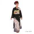 重厚な黒からスタイリッシュなグレーへのグラデーションが大人の魅力を感じる振袖、風に舞い踊る桜吹雪が魅惑的な印象を深めています。