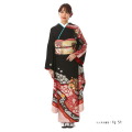 気品あふれる黒地にほどこされた絞りや金駒刺繍、金彩加工(きんだみかこう)が伝統的な美しさを醸す振袖です。なかでも上前正面、膝下のひときわ大きな赤の絞りが優美です。七宝つなぎや牡丹の花を絞りの技法で表わし、ところどころに金彩加工をほどこしています。