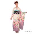 地色はオフホワイトからパープルへのグラデーションでシックな色合いですが、そこに描かれるふんわりとした大きな花束は可愛らしい色合いで、満開に咲き誇る姿が着物全体を華やかな仕上がりにしてくれます。