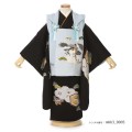 男性の第一礼装である「黒紋付」と同じ黒色きもの。やはり正統派さがあり、上品でフォーマルな印象が与えます。正式なイベントには、是非王道きものを選んでいただきたいです。そこに淡いブルーの被布を重ねました。大きく描かれるのは「鷹」。大空を飛ぶその姿は、逞しさを感じさせます。そして、遠くまで見渡すことが出来る鷹の目には、本質を見抜く、先を見通すという意味が込められます。また鋭い爪は、獲物を掴み離さないということから、つかんだ運や幸運を離さないという意味があります。男の子に相応しい文様で、子どもを想う親心が込められています。着物に描かれる文様は「宝尽くし」です。中国の吉祥思想のひとつ「八宝」から来ており、縁起の良い宝物を具象化して集めた文様です。打ち出の小槌、巻き軸、宝珠、隠れ蓑、分銅、丁子など宝物の組み合わせで、大変豪華で華やか。一緒に描かれる「松」は、寒い冬の間も緑色を保つことから、長寿、逆境に負けない生命力、忍耐力を意味します。また太い樹木を連想させ、力強さも感じます。男の子が着物を着る貴重な機会なので、文様の意味や願いを知ると着物選びも楽しくなり、とっておきの一着が見つかることでしょう。