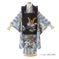無彩色な色づかいに落ち着きを感じ、そこに鮮やかで豪華な文様がよく映えます。着物に使用される濃いグレーは「錫色(すずいろ)」と呼ばれ、銀色に近い明るい鼠色のことです。淡いグレーは「白鼠(しろねずみ)」。上品な明るいカラ―です。この伝統色2色で、「矢絣(かがすり)」が描かれます。武士が戦うときの弓矢をモチーフにしたもので、強さを表したり、武運を祈願して武士の衣服の柄に用いられた縁起のいい文様がです。格調高い黒色の被布に描かれる「兜」。戦で頭を守る為に使用されてきた道具で、大切な頭を守るということから、災いから守り、長い人生で健康でありますようにというお守りの意味があります。また格が高い位でないと着用できないものなので、出世や大成の願いも込められます。「打ち出の小槌」は一生物やお金に困らないようにという意味があります。「松」は厳しい冬でも緑を保ち続け、「竹」は雪に負けずに真っすぐ伸びることから、逆境に負けない力強さや生命力をあらわします。正統派に仕上がっていて凛々しく重みのある装いは、大切な人生の節目におすすめしたい一着です。