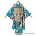パッと目を引く美しいピーコックブルーは日本名で「孔雀青(くじゃくあお)」と呼ばれます。孔雀の羽や首の部分に見られる美しい青に由来しており、ほんのり緑みを帯びています。そして柔らかいベージュの被布を合わせて、優しい印象になりバランスをとっています。描かれる文様は、古くから伝わる吉祥文様ばかり。被布中央に描かれる「兜」は、戦で頭を守る為に使用されてきた道具で、大切な頭を守るということから、災いから守り、長い人生で健康でありますようにというお守りの意味があります。また格が高い位でないと着用できないものなので、出世や大成の願いも込められます。「松」は厳しい冬でも緑を保ち続け、「竹」は雪に負けずに真っすぐ伸びることから、逆境に負けない力強さや生命力をあらわします。「六つ矢車」は、武士が使用する矢をモチーフにしたもので強さを意味します。明るく華やかな装いは、お子様着物の特権です。美しい着物に身を包む姿にもひとしおの感激が溢れることでしょう。