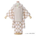 レトロ可愛く、あたたかみがあり優しい気持ちになるこちらの着物。被布の優しいナチュラルカラーはアイボリー。晒す前の木綿のような黄みがかった白色で、伝統色名では「生成色(きなりいろ)」と呼ばれます。肌を自然に明るく見せてくれ、写真撮影が多いシーンにおすすめ。そして着物地の薄くて明るい茶色は「白茶(しらちゃ)」。江戸時代に、茶人や数寄者が好む粋な色として流行しました。描かれる文様は、着物の柄のなかでも、特に人気の水玉柄。レトロでどこか懐かしさを感じるデザインで、大正時代に好まれた大正ロマンスタイルのような装い。古典すぎずにお洒落に着こなすことができ、柔らかいカラーでまとまりがあり上品さも感じる一着です。