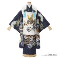 白色の被布が深みのある青色によく映えます。着物地の濃く暗い青色は「深藍(ふかあい)」。威厳を感じさせる色合いが質実剛健を尊ぶ中世の武士たちに非常に好まれました。さらに藍色は「褐色(かついろ)」と呼ばれ、「かつ」の響きが「勝つ」と同じことから縁起のいい色とされた、男の子のお祝い着にぴったりのカラーです。被布の中央に描かれる「兜」は、戦で頭を守る為に使用されてきた道具です。大切な頭を守るということから、災いから守り、長い人生で健康でありますようにというお守りの意味があります。また格が高い位でないと着用できないものなので、出世や大成の願いも込められます。「矢絣(やがすり)」は、武士が戦うときの弓矢をモチーフにしたもので、強さを表したり、武運を祈願して武士の衣服の柄に用いられた縁起のいい文様とされてきました。「打出の小槌」は一生物に困らないように、お金に困らないようにという意味があります。武士に関連する伝統色と力強い文様、威厳を感じる格調高き装いです。