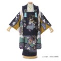 被布の濃い青色は「深藍(ふかあい)」。威厳を感じさせる色合いが質実剛健を尊ぶ中世の武士たちに非常に好まれました。さらに藍色は「褐色(かついろ)」と呼ばれ、「かつ」の響きが「勝つ」と同じことから縁起のいい色とされてきました。全体的に深みのある落ち着いた色合わせですが、黄色「山吹茶(やまぶきちゃ)」が良いアクセントカラーになっています。被布に描かれる力強い「鷹」は、昔から男の子のお祝い着でよく目にする文様です。大空を飛ぶその姿は、逞しさ神々しさを感じさせます。そして、遠くまで見渡すことが出来る鷹の目には、本質を見抜く、先を見通すという意味が込められます。また鋭い爪は、獲物を掴み離さないということから、つかんだ幸運を離さないという意味があります。能楽や謡の伴奏でよく見る和楽器の「鼓」。教養の象徴とされ、「物事が良く成る」などにかけて、成功を表すとされています。古典的なデザインですが、個性も感じるこちらの着物。大切な想いを着物に託し、寄り添ってくれる、そんな一着です。
