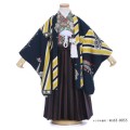 紺色の無地を基調として、部分的に紺、黄色、白、の縞模様が描かれた上に、船や車が描かれた羽織が目を引く、モダンなコーディネートです。世界を巡る豪華客船を思わせる船、昔の映画に出てきそうな自動車。乗り物が古き良き時代を思わせる画調のため、決して子どもっぽい雰囲気になってしまうことがありません。また、紺と黄色の組み合わせもあいまって、モダンな雰囲気が漂います。着物は、グレー地に、日本らしい文様がカラフルに描かれたものを合わせました。羽織と着物が、色合いはシック×カラフル、絵柄は大柄×小柄、の組み合わせとなっているため、とてもバランスがとれたコーディネートです。袴は、すっきりとした縦縞のもの。縞の色の紺、赤、グレー共に羽織と着物に使われているため、羽織と着物をつないで調和をとってくれる袴です。本人も喜んで着てくれて、ちょっと個性的なものを選びたい、そんな場面にぴったりの装いです。