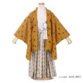 日本の色名でいうと深黄(ふかきき)や小麦色が近いでしょうか、七五三の羽織としてはあまり多くはない色合いです。そんな地色の上に打ち出の小槌、凧、扇などの柄を散りばめた、気張らない装いです。実った稲や麦の穂を思わせるような、茶色がかった黄色。原色も多い七五三の着物の中では一見地味に思えるかも知れませんが、実は力強い色味です。豊かな実りを思わせる色は、昔から縁起が良いとされてきた色でもあります。描かれ散りばめられた柄は、打ち出の小槌、凧、扇といったおめでたい柄。打ち出の小槌は言わずもがな、凧は空高く上がっていく姿が、扇は末広がりのその形が、縁起物とされています。手描き風のタッチも、柄の控えめなサイズとあいまって、とても可愛らしい雰囲気です。いかにも晴れ着といった雰囲気ではありませんが、この気張らない色と柄が何とも愛らしく、まだあどけない3歳の七五三に、楽しく和やかな雰囲気を漂わせます。あくまでも記念の日の装いであるため、白の着物と縦のラインが雰囲気を引き締める袴を合わせ、くだけすぎないコーディネートとしました。お子さんの自然な可愛らしさを引き出したい、そんなご希望の親御様にお勧めの装いです。