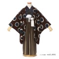 海老茶色の地の上に紺色の丸模様が全体的に散らされた、個性的でモダンな装いです。濃い海老茶色といったところでしょうか、赤み、紫みのかかった茶色の地に、白い輪郭、中は紺色の丸模様が散らされた羽織です。丸模様は、真ん丸ではなくラフに手描きされたような丸。中の紺色も、ところどころかすれていて現代アートのような雰囲気が漂います。そんな、洋服のプリント地のような遊び心あるデザインですが、海老茶と紺という落ち着いた色遣いのお蔭で、全体の印象はカジュアルになることなく、シックさとモダンさを漂わせています。輪郭の白の分量が絶妙で、落ち着いた色味の中に抜け感を与えてくれていますね。そんな羽織に、縞の着物と袴を合わせることで、着物らしいコーディネートといたしました。着物の世界では、曲線的な柄と直線的な柄、大きな柄と細かな柄といったように、要素の異なる柄を組み合わせるのは、コーディネートのセオリーの1つです。こちらの組み合わせも、羽織が曲線の丸模様であるところに、着物と袴は直線の縞模様とし、さらに、着物と袴で同じ縞でも大小をつけました。3つのバランスが整い、動きを感じさせる羽織を着物と袴が引き締めます。大人っぽさや個性が欲しい方にお薦めの装いです。