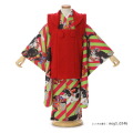 ビビットな明るい色使いと、可愛らしい文様が楽しい気持ちにしてくれます。「赤色」は古くより厄除けの色とされてきました。明るいグリーンは「若草色(わかくさいろ)」。早春に芽吹いた若草のようなあざやかな黄緑のこと。古くから見られる伝統的な色で、もとは平安装束の重ねの色目として使用されました。「若」には、新鮮な、新しいなどの意味があり、フレッシュさを感じる色味はお子様のお祝い着にピッタリです。描かれる文様は「縞柄」。直線は厄除けの意味があり、お守りのような役割をしています。そして可愛らしい猫が手毬で遊んでいます。手毬は平安時代に貴族の遊び道具だったことから高貴さや上品さの象徴とされています。また何事も丸く収まるように、丸く大きく成長しまうようにと願いが込められています。レトロな雰囲気で、遊び心たっぷりのこちらのお祝い着。子どもらしさ全開の色味と可愛い文様は、今しか着れない良さがあります。明るく楽しい気持ちにしてくれる装いで、素晴らしい一日を迎えてください。