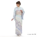 淡い水色のお着物にちょっと大きめに描かれたお花が清楚でかわいらしい訪問着です。こちらは世界的なデザイナーである桂由美がデザインした訪問着です。桂由美というと、バラをモチーフにした斬新な黒留袖や、mtu_106のようなくっきりはっきりとしたデザインのお着物が特徴のひとつ。ですが、こちらの訪問着はそれとは雰囲気がちがい、ふわっとやわらかな印象のデザインになっています。お花の柄とお着物の色の境目をあえてぼかすことによって、おぼろがかったやさしい感じに仕上げられています。大きさや形が少しずつちがうお花。淡いピンクや淡い紫の色合いも品の良さを感じさせます。お着物にはラメや金の加工もほどこされています。歩いたり座ったり、着ている人の動きに合わせて光を反射し、きらきらと輝く様子も美しいですよ。