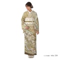 着物地は「亜麻色(あまいろ)」と呼ばれる伝統色。亜麻を紡つむいだ糸の色のような黄色がかった薄茶色のが使用されています。落ち着きのあるシックな色使いですが、着物全体に文様が描かれており非常に豪華な訪問着です。文様のぼかしが美しく、高級着物「辻が花」を彷彿とさせます。特定されることのない抽象的に描かれているものもありますが、よく見ると「松」や「桜」など縁起のいい吉祥文様が描かれています。「松」は、一年中美しい緑を保つことから、逆境に負けない力強さや生命力を表現します。「桜」は、咲き誇る姿から繁栄や豊かさを表しており、また春に咲くことから新しい門出を意味します。そして「波」文様は、寄せては返すを繰り返し、果てがないことから永遠、長寿を意味します。とても華やかながら、ぼかしの技法を使うことでどこか柔らかく優しい雰囲気に仕上がっています。
